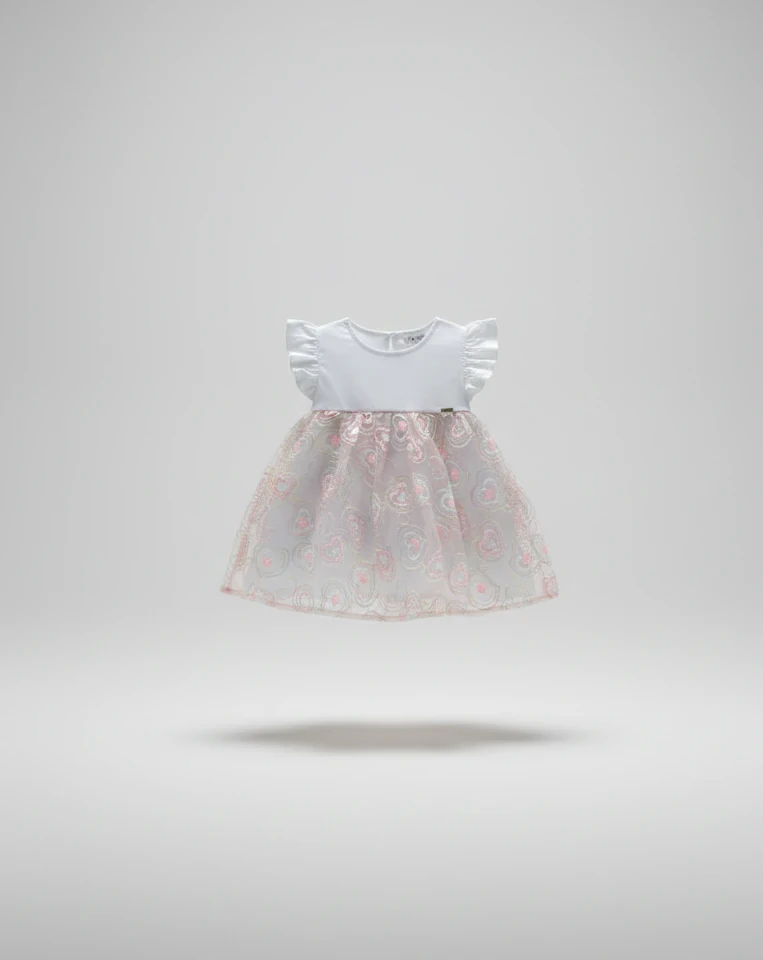 Deixe sua pequena brilhar com este vestido que é puro encanto. Combinando uma blusa clean de mangas curtas com uma saia volumosa e rica em detalhes, ele é a escolha perfeita para aniversários, ensaios fotográficos e momentos especiais que pedem um visual inesquecível.