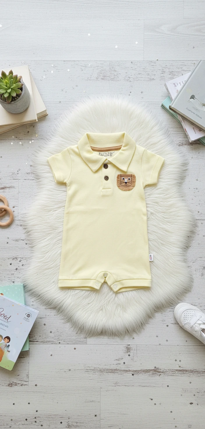 Este macacão estilo romper une a elegância da gola polo com a fofura de um bordado exclusivo de leãozinho. É a peça única ideal para manter o bebê arrumadinho e extremamente confortável, seja para um passeio especial ou para o dia a dia.